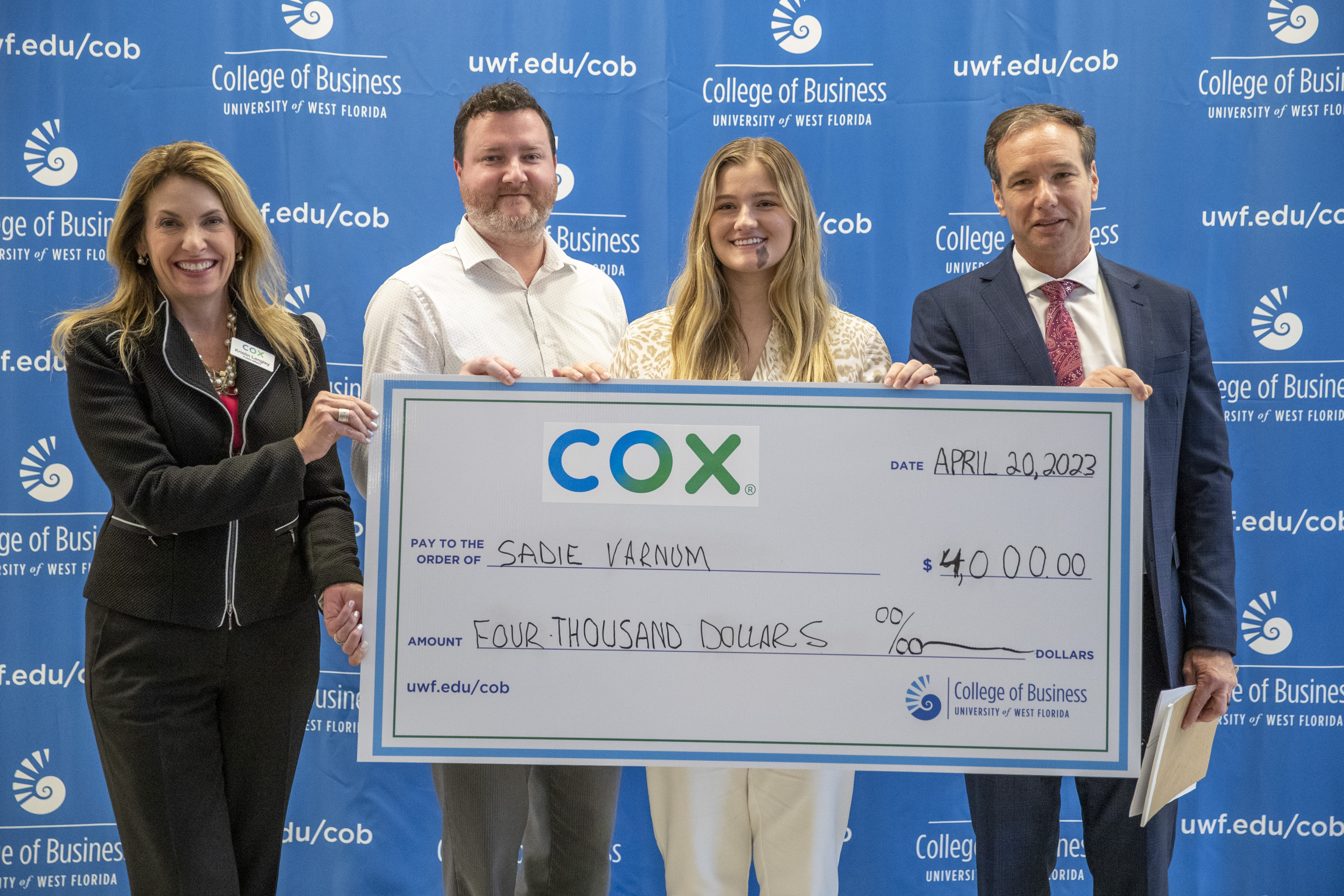 The Center for Entrepreneurship held the Cox Pitch Competition and awarded $7,300 in tuition money. Sadie Varnum claimed the $4,000 first prize for her pitch, "Sadie's Thrift Finds." Benjamin Cadeau won $2,200 for his "Floating Rack" pitch and Sage Spiess won $1,100 for "Apex Fitness." Dr. Tim O'Keefe, One in a Row Ventures Partner Jason Crawford, Cox Communications Director of Public Affairs Kristin Longley and Greater Pensacola Chamber President/CEO Todd Thomson served as judges.