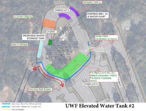 The new water storage tank by well will be built to increase the campus water supply by over 300,000 gallons. The tower will be roughly 175’ tall. The contractor plans to mobilize in February 2026. This will mainly be fencing, Stormwater Pollution Protection Plan (SWPPP) and other misc. items in anticipation of site work. The mobilization will be change the traffic pattern through October 2026. UWF Facilities and the Contractor are also likely make some changes to this plan once the crane is on site.