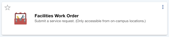 Placing large items or cardboard next to campus trash dumpsters and/or over filling the trash dumpsters with large items or debris, is an ongoing issue on campus. If you have large trash items, such as pallets, visit MyUWF to submit a Facilities Work Order (see app image below). Request to have your item(s) picked up and placed in one of the construction debris dumpsters on campus. Email photos of your debris in the location where it should be collected to maintenance@uwf.edu. This will allow the Facilities team to know what to pick up.